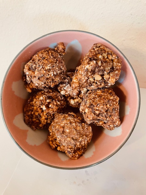 Ingredients: Walnuts, Almonds, Pecans, Peanut Butter (organic dry roasted peanuts, organic palm oil), Dark Cacao Chocolate Chips (dark chocolate (unsweetened chocolate, cane sugar, sunflower lecithin [emulsifier], vanilla extract [water, ethyl alcohol, vanilla bean extractives]) agave syrup (agave syrup, water, potassium sorbate), vanilla extract (water, ethyl alcohol, vanilla bean extractives)